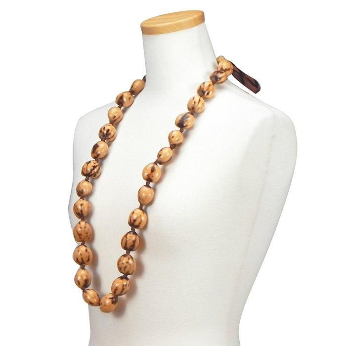 32個の天然のククイナッツが、1/4インチ(約6.4mm)幅のリボン2本に結んであります。